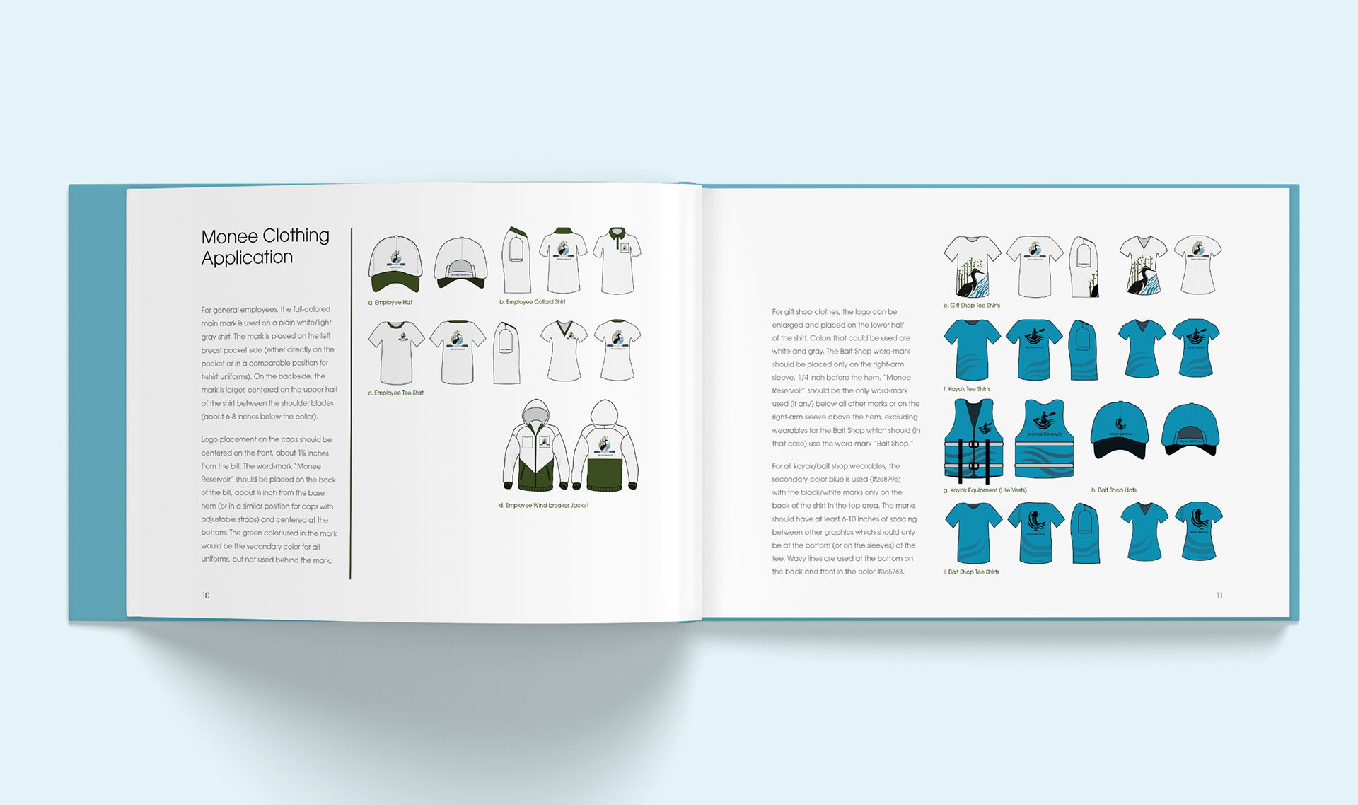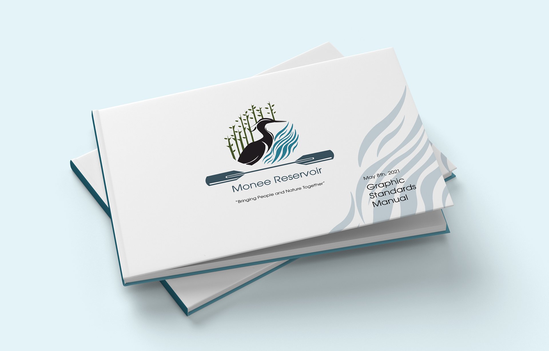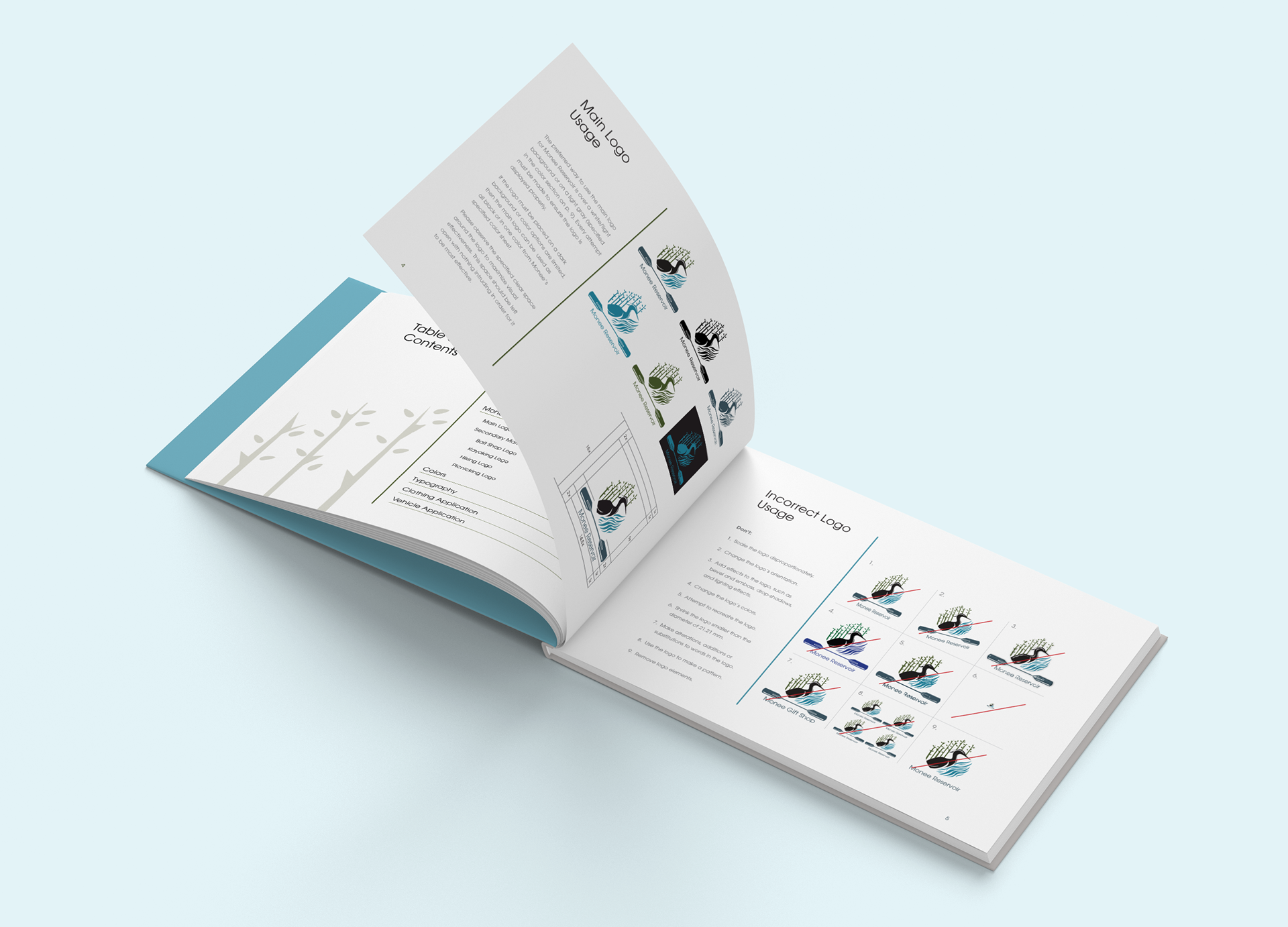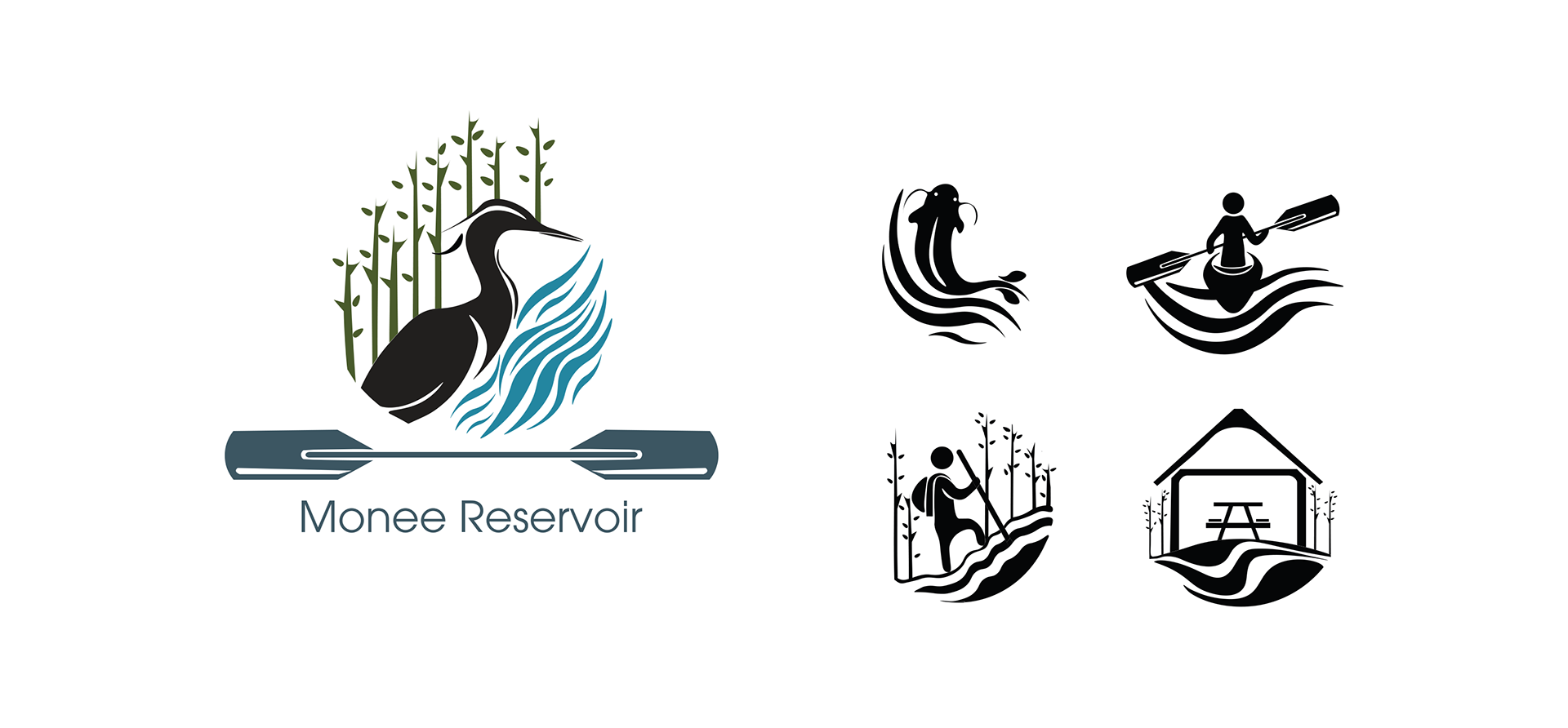 Create a logo, logo applications, and a manual for Monee Reservoir to describe how to use the created marks. Also, create a consistent brand to appeal to a wide audience range for the park, from kids to moms, to older fishermen. (Audience: young to old fishermen, kayakers, moms picnicking, ages 13-70-year-olds.)