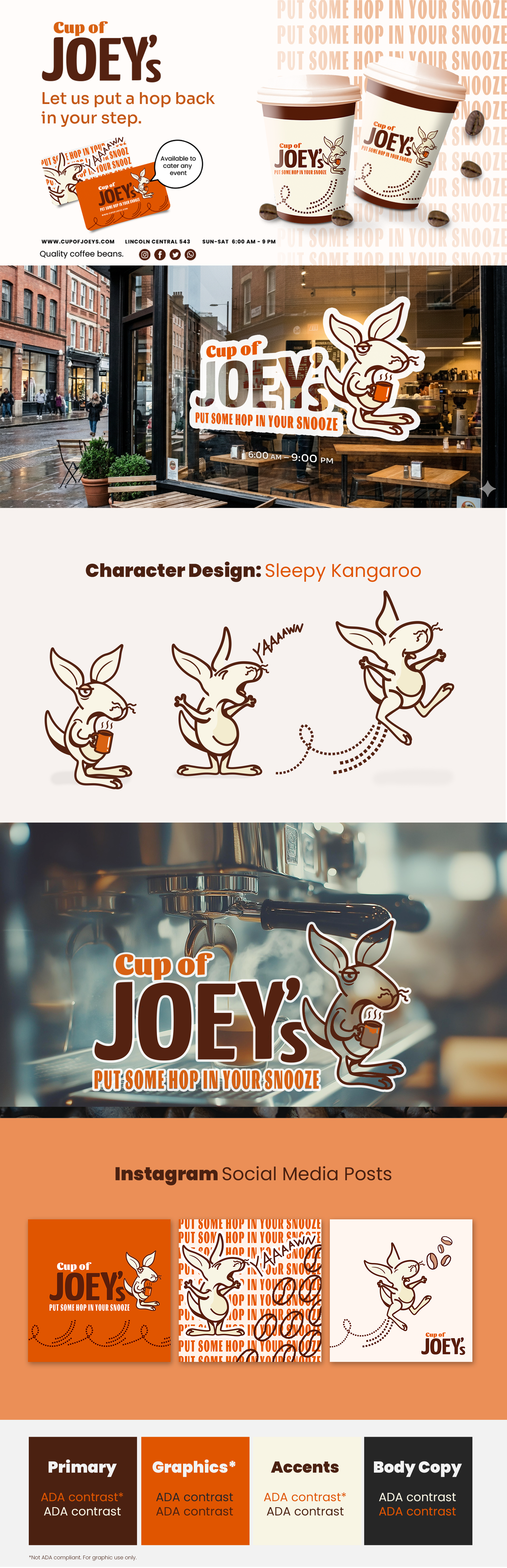 The heart of the brand is Joey, a perpetually exhausted kangaroo mascot. By leaning into a classic 1970s illustration style and a warm, earthy palette of burnt orange and deep cocoa brown, the branding creates an immediate sense of comfort. The jarring juxtaposition of a sleepy mascot selling high-energy caffeine provides a quirky, relatable hook that stands out in a crowded market of "minimalist" coffee shops.